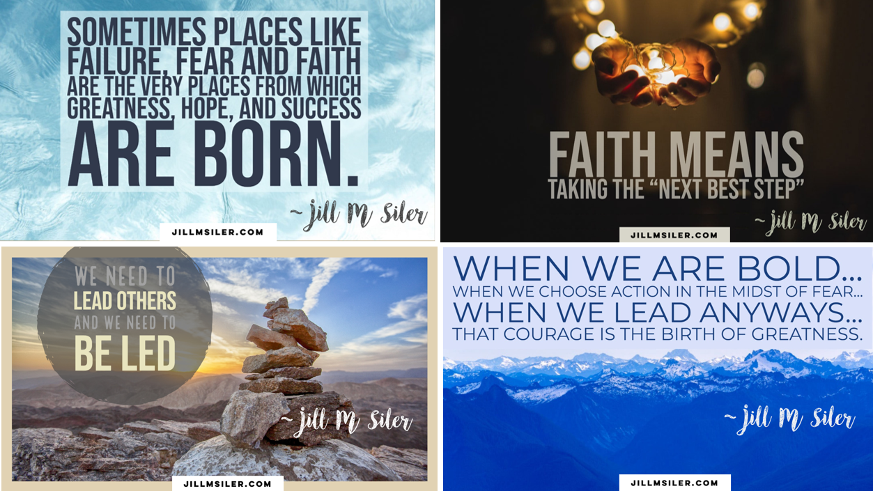 Tip #5 – Find Graphics & Images that help deepen the impact of your message. Graphics can help in a number of ways. Not only can they provide the speaker a visual cue to know where they’re at and where they’re going; they can also make a profound impact on your listener. The key to graphics is to remember that images are often more powerful than words; and that less is often better than more (less on a slide; less slides in a deck). Be concise. Also, remember to focus on your thoughts. One great piece of feedback I received in preparing for my recent talk was to de-emphasize other people’s thoughts and emphasize my own. I used a lot of graphics for quotes that other people said. But one of my listeners gave me a precious gift when she said “those were great; but your words were the most powerful – that’s what I’ll walk away with.” So I transitioned my slides to highlight my big ideas instead. And she was right – it was powerful. I use Adobe Spark to create mine but there are a ton of free and nominal cost programs that can help. Here are a few examples of some of the images I created: