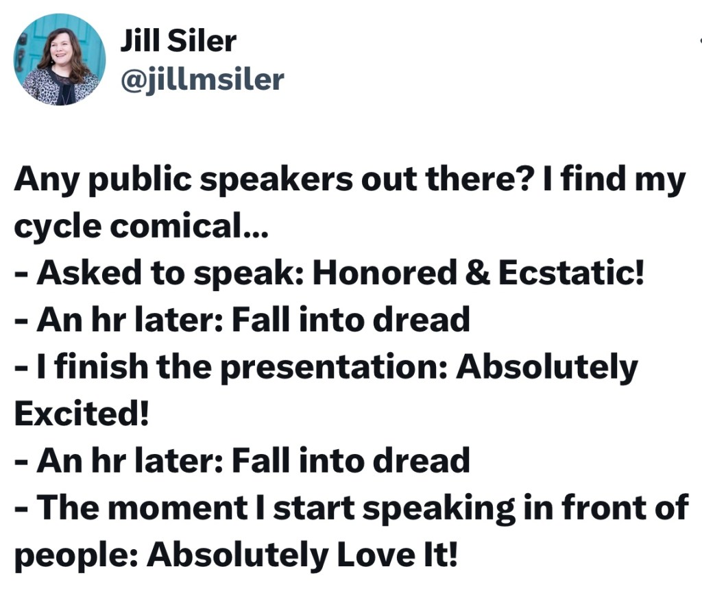 I have been speaking in public for as long as I can remember. As far back as middle school I remember having opportunities to speak in front our student body. In high school I had the opportunity to participate in Model UN and attend summer leadership conferences – both of which involved presenting in front of large groups of people. In college, I was a part of a leadership program where athletes from all different sports programs traveled to area schools and spoke to kids about things like working hard, overcoming obstacles and dreaming big. And all throughout my professional career I have had opportunities to speak – from local conferences to TASSP to working with Lead4ward to TASA to TCWSE. With all of this, there is one thing I can say with confidence… I have a LOVE / HATE relationship with public speaking.