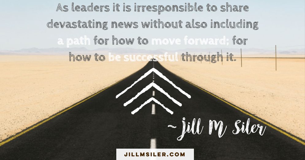 The next key I believe is the difference between managing a crisis vs. leading through crisis, which is to lay out a path. As leaders it is irresponsible for us to share devastating news without also including a path for how to move forward; for how to be successful through it. The path doesn’t have to be worked out completely – in fact, the path can be the steps you’re going to take to attempt to solve the problem itself. But whenever possible, anytime bad news is given, it should be accompanied by the next steps that you’re going to take to try to overcome it and grounded in belief that it can be done and done well.