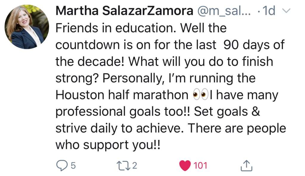 Just this week, one of our rockstar #sistersupts, Dr. Martha Salazar-Zamora (Tomball ISD) shared her BIG goal of running the Houston Half-Marathon next month… Wow! 🙌